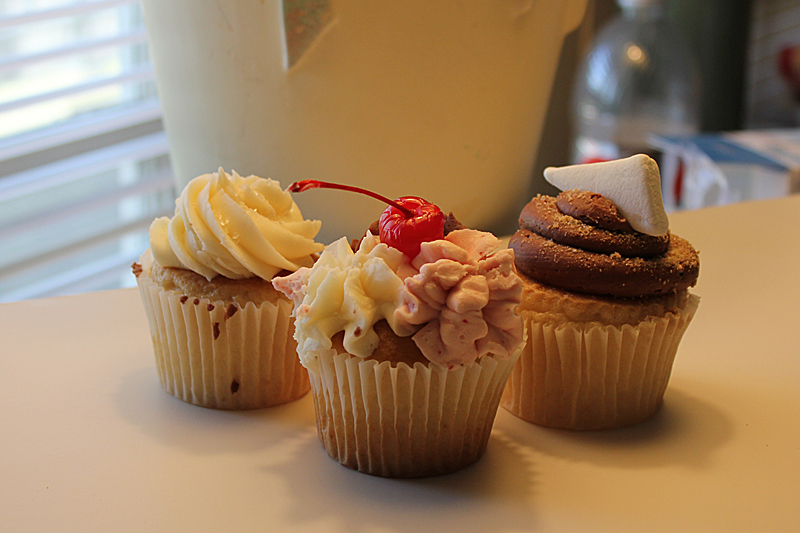 And the Campfire is a vanilla cupcake with a creamy vanilla center and a chocolate buttercream garnished with marshmallows and graham cracker crumbs.