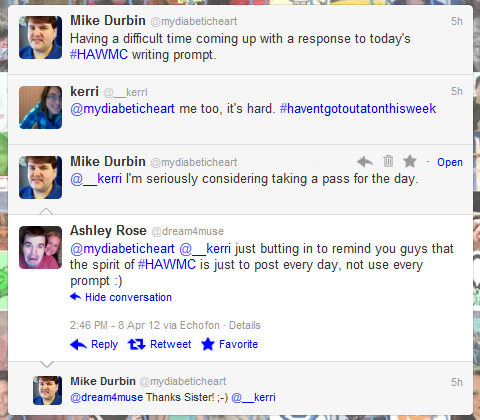 For some reason or another, I’ve struggled with writing a response to this prompt today.  When I tweeted that fact earlier today and a brief exchange between Kerri, Ashley & I followed.