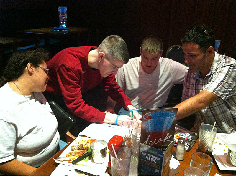 And last but not least, there was the DOC t-shirt. When I heard that Simon was going to be visiting and that a meetup was being planned, I decided I wanted us to be able to give him something special to commemorate his trip. So, I had a t-shirt made bearing the DOC logo I created during Diabetes Art Day last September, and presented Simon with it on Saturday. Everyone signed it for him, and he’ll be carrying it to other meetups during the remainder of his time in the U.S. so others can sign it as well. It is, in fact, a gift that keeps on giving.