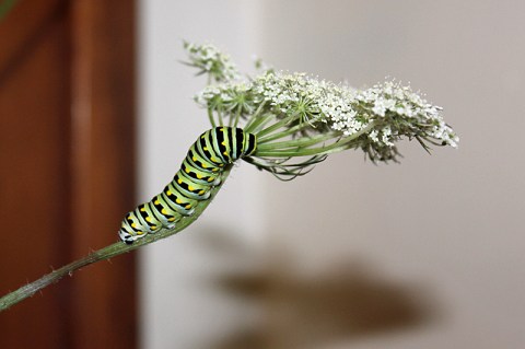 The cool little caterpillar that came in on flowers that April brought in from the garden. He turned into the butterfly pictured above. 🙂