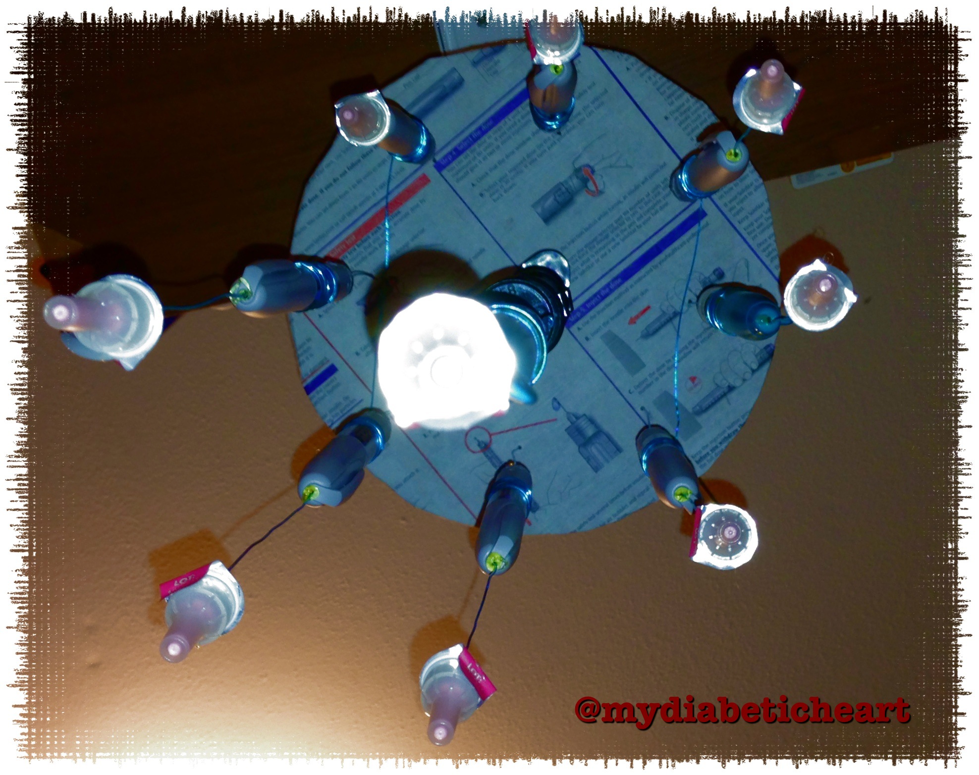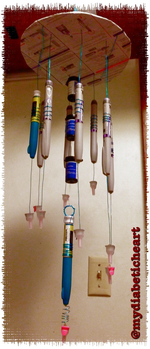 The circle that forms the top of the mobile is cardboard from a box that received diabetes supplies in a while back. It’s covered with the full color instruction sheet that is included in a box of Lantus pens. Each Pen-dulum is anchored to the top with glue, with a pen needle as a cap. And each pen-dulum is a little shorter than the next, and are hung in descending order, creating a spiral effect. The spiral effect is symbolic of the fact that sometimes, diabetes spirals out of control, and the steps one has to take to climb back up to regain control. And the Byetta pen in the center? Well, that’s the very last Byetta pen that I used before switching to Victoza a couple of weeks ago. It’s topped with a blue circle that April made with the crafting wire.