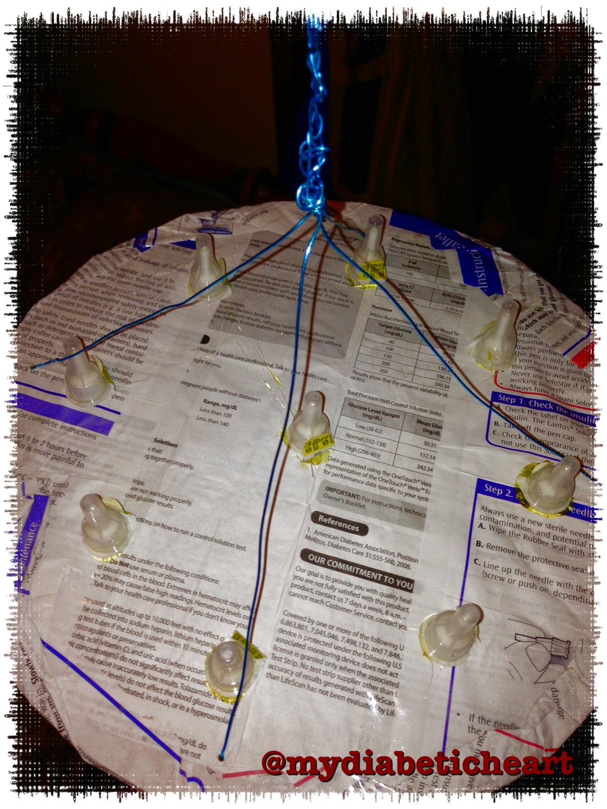 Over the last few years, my entries for this event have been solo efforts, thought up, designed and crafted by me. This year, however, April got in on the fun, too. She’s had an idea for creating a hanging mobile using diabetes supplies for a couple of years now, but we just haven’t been able to get it done. We discussed ideas over the last week and decided this would be a great time to make it happen.