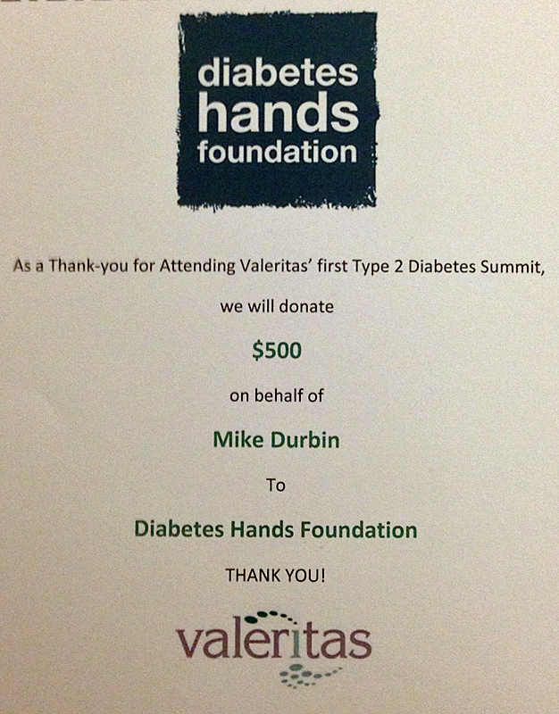 As thanks for attending the T2D Summit, Valeritas offered to make a donation to a diabetes charity of our choice. I chose the Diabetes Hands Foundation.