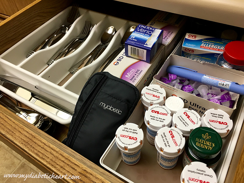 The final topic for Diabetes Blog Week is about Diabetes Tips & Tricks.  The one I have to offer has to do with where I keep my medications and supplies now.