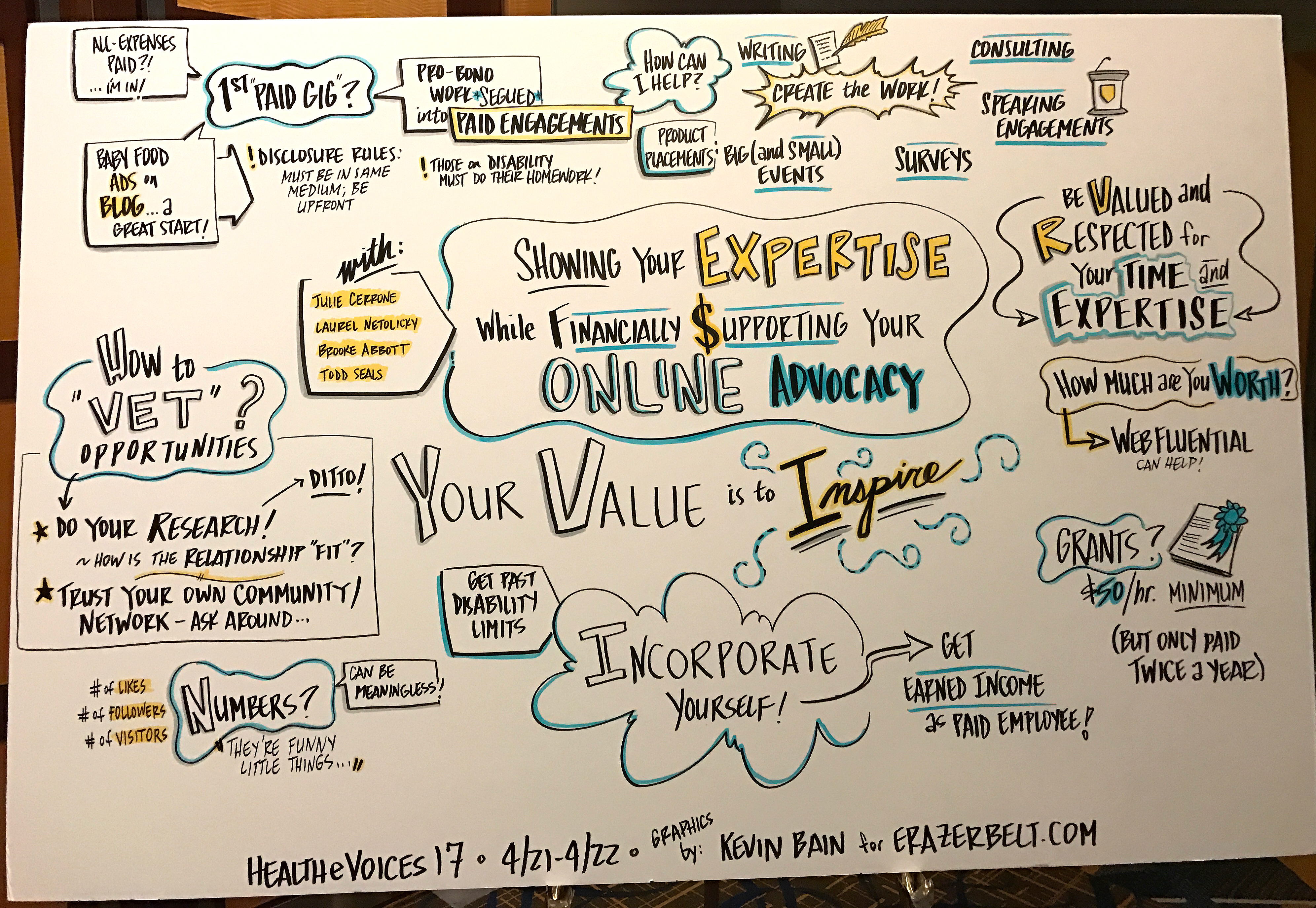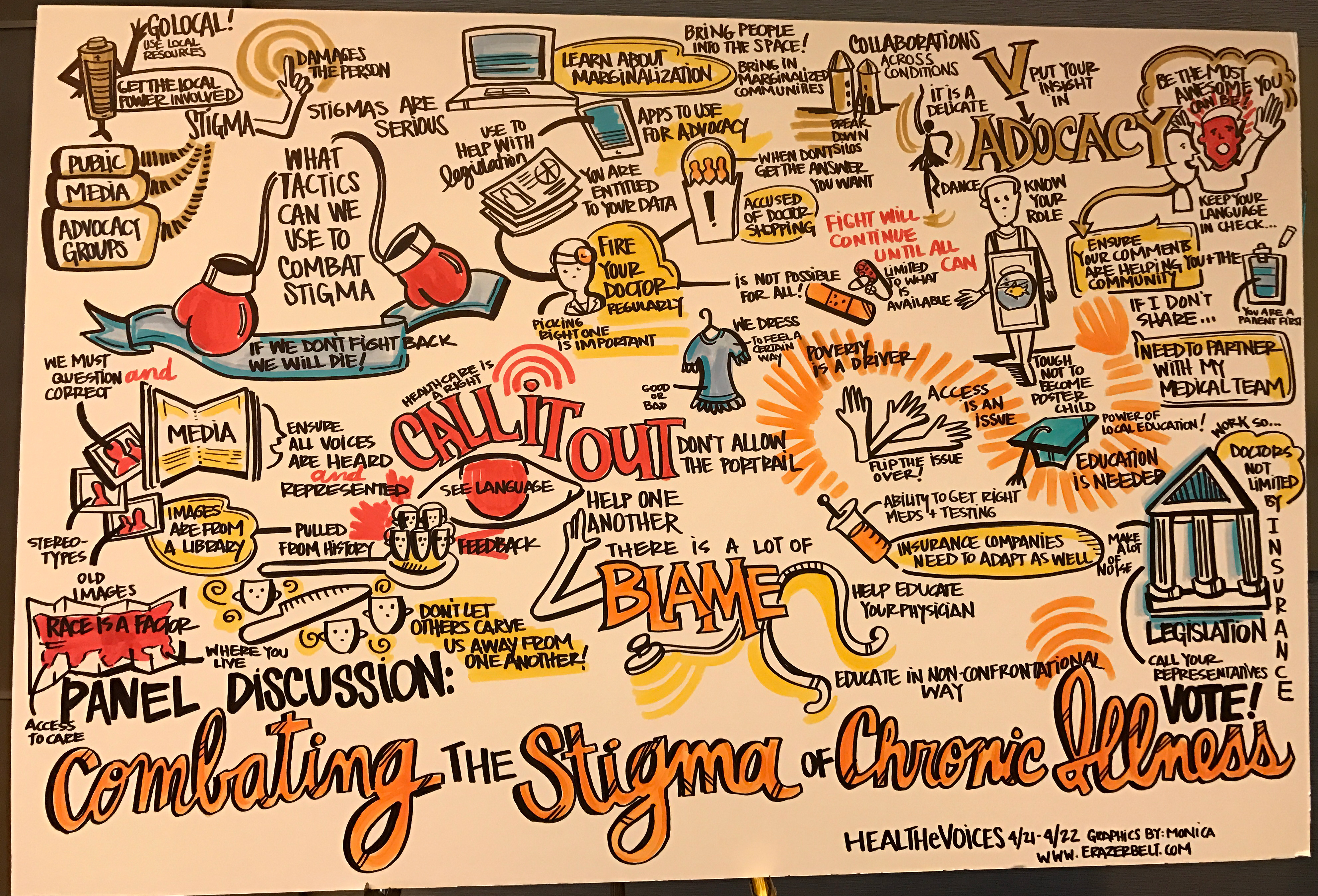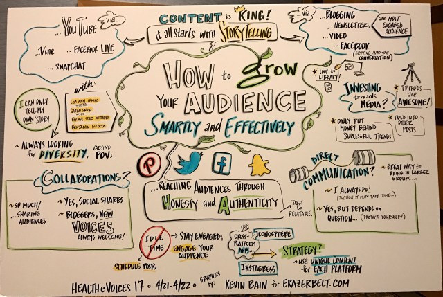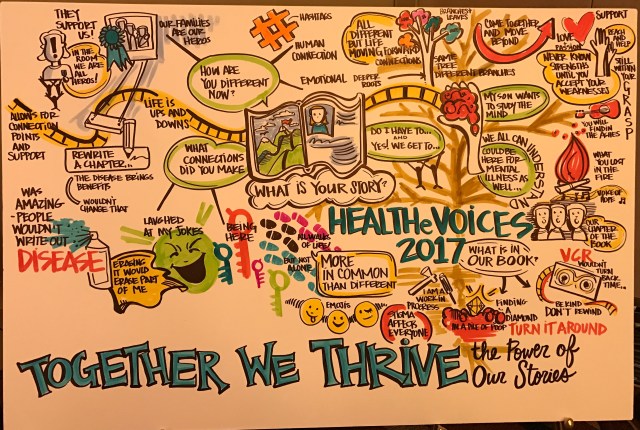 During the weekend of April 21-23, I had the opportunity to attend the HealtheVoices17 conference in Chicago. It was an amazing experience, bringing together 105 advocates from around the world, who represented 35 different health conditions. I’m still trying to wrap my head around the events of the weekend, and will have more posts on it soon. As a start, though, I want to share the illustrations that two incredibly talented artists created to document each session as they were taking place. Great work, Monica and Kevin!